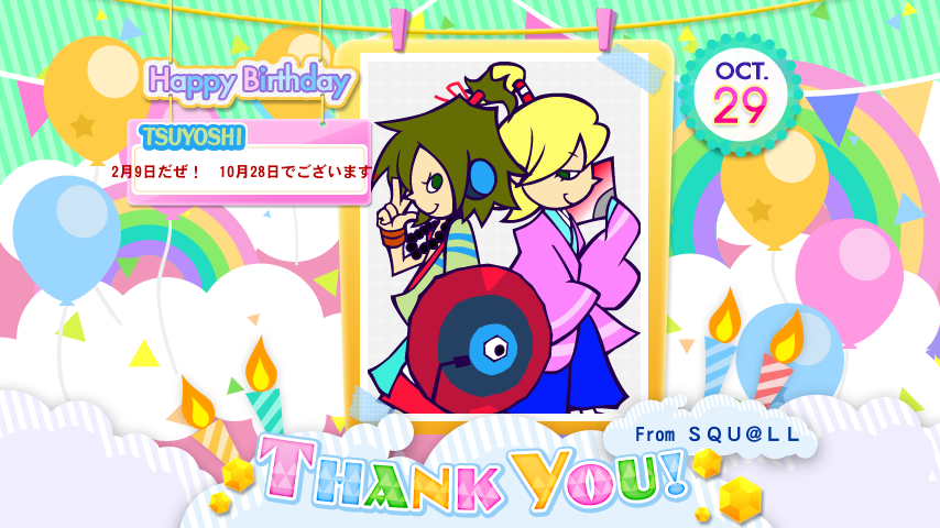 - 같은 날에 작곡가 가쿠타 토시유키 (角田利行, a.k.a. L.E.D.) 씨도 생일이지만 그를 본따 만든 팝픈뮤직의 캐릭터는 아직 없다. 코에즈카 요시히코씨와는 이름의 '요시'가 같이 들어가서 두 사람이 함께한 것이 '츠요시'로 J-HOUSE POP 장르 두 곡을 작곡하였다.