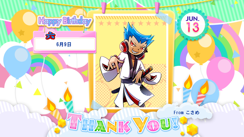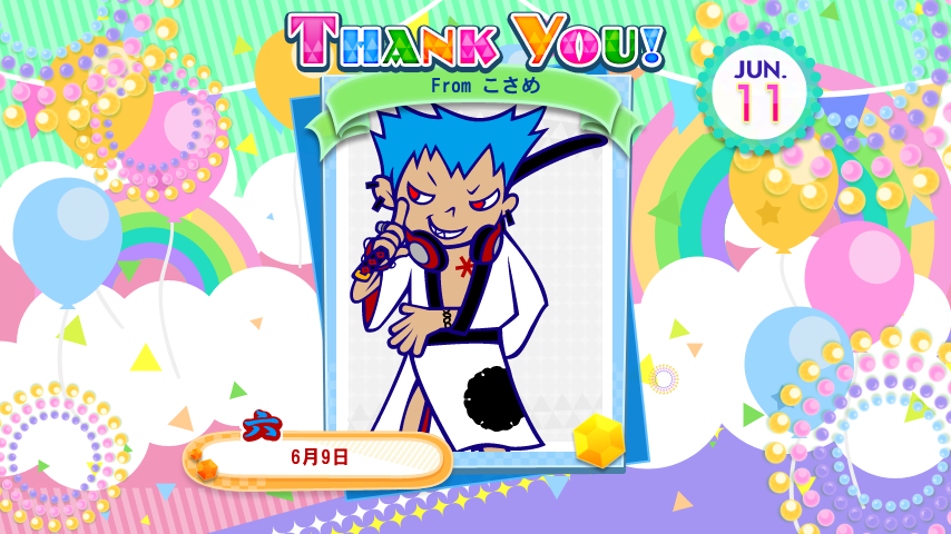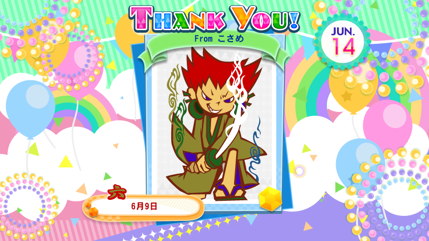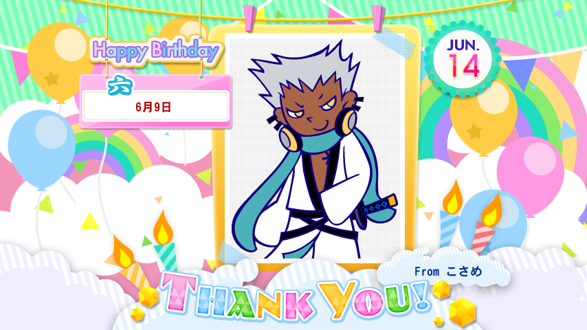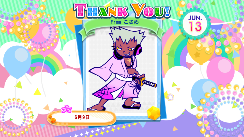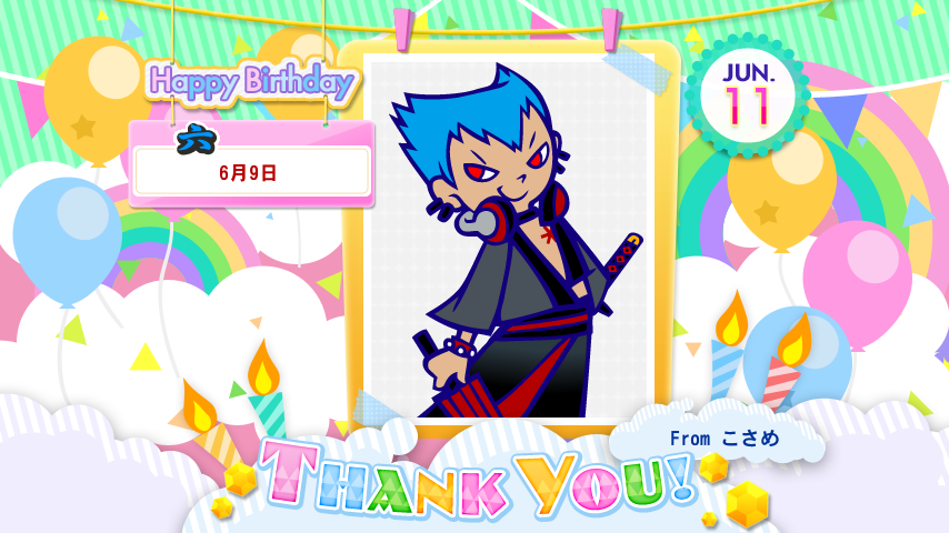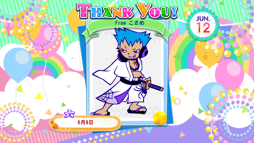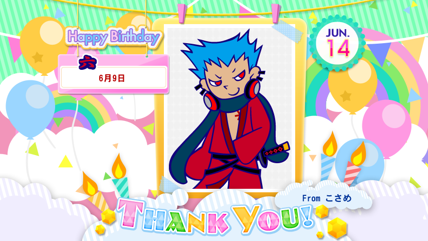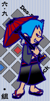 ▶ "剣と言の極致を究めんと世をさすらう憂国のヒップロックサムライ。 各地の街中に彼が書き残した書の収集家がいるほどの人気なんだよ。 音即是言。言即是音。侍魂持ていざ皆ならん時代の先行者。いえあ。" (pop'n music 6 캐릭터 프로필)