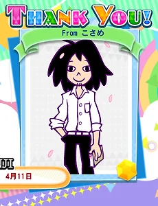 WAC51 6월 28일 : 에이토 (泳人) 1. 캐릭터 프로필★ 이름 : 에이토 (泳人 ; EITO) ★ 생일 : 6월 28일 ○ 성별 : 남성○ 출신지 : 미야자키 宮崎○ 취미 : 먼 거리 수영 遠泳 ♡ 좋아하는 것 : 풀 사이드[* poolside. 수영장(풀) 주변의 평평한 곳]의 평화 × 싫어하는 것 : 풀 사이드를 뛰어다니는 아이들 ○ 등장 팝픈뮤직 카드 [노멀] TS Vol.3 28번 (12 버전), LT Vol.3 47번 (LT 버전-WIN 애니메이션) [레어] fantasia Vol.3 2번 "熱いぜ!スポーツの祭典" [스토리] LT Vol.2 3번 "みんなで臨海学校!" 2. 캐릭터 소개가. 캐릭터 한 줄 프로필 ▶ 今日もいっちょプールサイドの平和を守ってやるぜ!「そこっ!プールサイドは走らずに!」 (12 이로하 캐릭터 프로필) ▶ ".. 2025. 6. 28. 6월 25일 : 라피스 (Lapis) 1. 캐릭터 프로필★ 이름 : 라피스 (Lapis ; ラピス)★ 생일 : 6월 25일 ○ 성별 : 불명○ 출신지 : 라피스토리아 ラピストリア ○ 취미 : 라피스토리아를 지켜보는 것 ラピストリアを見守ること ♡ 좋아하는 것 : 세계의 번영 世界の繁栄 × 싫어하는 것 : 예정 밖으로 일어난 일 予定外の出来事○ 등장 팝픈 카드 [노멀] ec Vol.3 56번 (Change 카드) [레어] ? 2. 캐릭터 소개가. 캐릭터 한 줄 프로필 ▶ "라피스토리아의 번영을 바라는, 태초의 라피스" ラピストリアの繁栄を願う、原初のラピス (LAPISTORIA 캐릭터 프로필) § "신의 의사를 이어 라피스토리아의 번영을 바라는, 태초의 라피스" (캐릭터 일러스트 DVD판 캐릭터프로필) ▶ ポップンワールドに遊びに来たラピスさん。.. 2025. 6. 25. 6월 17일 : 나카지 (NAKAJI) 1. 캐릭터 프로필★ 이름 : 나카지 (NAKAJI ; ナカジ) ★ 생일 : 6월 17일○ 성별 : 남성 ○ 출신지 : 도쿄 東京○ 취미 : 그럴 여유 없어 そんな暇ないし ♡ 좋아하는 것 : 어둠 暗闇 × 싫어하는 것 : 안경이라던가 メガネとか ○ 등장 팝픈뮤직 카드 일람 [노멀] fantasia Vol.3 57번 (change) [레어] TS Vol.1 12번 "ギラギラ人生。とは何だ?" / SP Vol.3 5번 "BEMANI学園!DJ部"2. 캐릭터 소개가. 캐릭터 한 줄 프로필 ▶ "이 세계는 바보 바보같은 러브송이 넘쳐난다. 질식할 것 같아. 더럽혀진 공기에 안경이 흐리다." 此の世界は莫迦莫迦しいラブソングが溢れ。窒息しそう。汚れちまつた空気にメガネが曇るんだ。(13 카니발 캐릭터 프로필) ▶ 学生さ.. 2025. 6. 17. 6월 17일 : 나나시 (NANASHI) 1. 캐릭터 프로필 ★ 이름 : 나나시 (NANASHI ; ナナシ) ★ 생일 : 6월 17일 ○ 성별 : 남성 ○ 출신지 : 도쿄 ○ 취미 : 그러니까 그런 여유 없다니까 ♡ 좋아하는 것 : 어둠 (웃음) × 싫어하는 것 : 안경이라던가 (웃음) ○ 등장 팝픈뮤직 카드 일람 [노멀] 없음 [레어] 없음 2. 캐릭터 소개가. 캐릭터 한 줄 프로필 ▶ 宴もたけなわ。浮かれる世の中嘘だらけ。顔隠してへのへの名無し。今日のすがたかたちに、意味なんかない。 (16 PARTY♪ 캐릭터 프로필) 나. 캐릭터 디자이너 코멘트 (Design by shio) この曲もたくさんリクエストいただきましたね~。みんなのコメントがギラギラメガネメガネ言い過ぎでうけました。 ギタドラで担当させていただいたムービーネタで、こっちでも遊ばせてもらっちゃいました。へ.. 2025. 6. 17. 6월 12일 : P-1 & P-2 1. 캐릭터 프로필★ 이름 : P-1 & P-2 ★ 생일 : 6월 12일 ○ 출신지 : 러시아 ○ 취미 : SF영화감상 ♡ 좋아하는 것 : 만담 × 싫어하는 것 : 녹 ○ 등장 팝픈 카드 : [노멀] SP Vol.2 3번 (3 버전) / LT Vol.3 11번 (9 버전) - [레어] LT Vol.1 6번 "FULL OF SMILE ぼくらの世界" 2. 캐릭터 소개 § ロシアで開発された家庭用ロボット。寸法を間違えたために廃棄されかかったんけど、変なところで漫才の才能を見い出されてからは芸人ロボットになったんだって。P-1(長身の方)は目立ちたがりな性格。P-2(短足な方)は感情をあまり表に出さないクールなヤツなの。 (pop'n music 3 캐릭터 프로필) ☞ [관련 캐릭터] P-14 3. 캐릭터 담당곡[pop'n music .. 2025. 6. 12. 5월 31일 : 제이드 (Jade) 1. 캐릭터 프로필★ 이름 : 제이드 (Jade ; ジェイド) ★ 생일 : 5월 31일 ○ 성별 : 남성○ 아이콘 : 반짝반짝, 물음표(?)○ 출신지 : 라피스토리아 ラピストリア○ 취미 : 신이 되는 것 神になること ♡ 좋아하는 것 : 온순한 것들 従順なものたち × 싫어하는 것 : 제어할 수 없는 힘 制御できない力 ○ 등장 팝픈 카드 [노멀] - ec Vol.1 53번 (change 카드) - うさ猫 Vol.1 50번 (LT버전 - LOSE 애니메이션) - 카드커넥트 Vol.7(해명리들즈) (라피스토리아 버전) - 카드커넥트 Vol.16(Jam&Pizz) (해명리들즈 버전) [레어] - ec Vol.1 3번 "神部屋・mishmash! -beside B-" (2번과 세트카드, 디자이너 ちっひ / .. 2025. 5. 31. 5월 22일 : 머머 트윈스 (murmur twins) 1. 캐릭터 프로필★ 이름 : 머머 트윈스 (murmur twins ; マーマーツインズ) ★ 생일 : 5월 22일 ○ 아이콘 마크 : 음표, 고양이○ 출신지 : 우리들의 집 ぼくたちのおうち ○ 취미 : 그림그리는 것 おえかきすること ♡ 좋아하는 것 : 케이크. 고양이. 노래. …많아! ケーキ。ねこ。うた。・・たくさん! × 싫어하는 것 : 귀신과 치과의사. 무서워! おばけとはいしゃさん。こわい!○ 등장 팝픈뮤직 카드 [노멀] - TS Vol.3 24번 (10 버전) - ec Vol.2 41번 (10 버전 - WIN 애니메이션) [레어] - fantasia Vol.1 8번 "ボナペティ☆パティシエごっこだよ~" - 